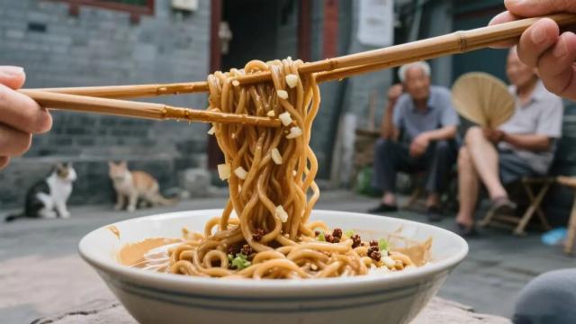 碼菜也有講究:黃瓜絲要切得細如發絲,綠豆芽得用沸水焯到斷生,再配上點焯過的菠菜段。把醬一澆,菜一撒,筷子攪開的瞬間,芝麻香混著菜香直往鼻子里鉆,呼嚕嚕吃下去,額頭上冒點小汗,暑氣全消。