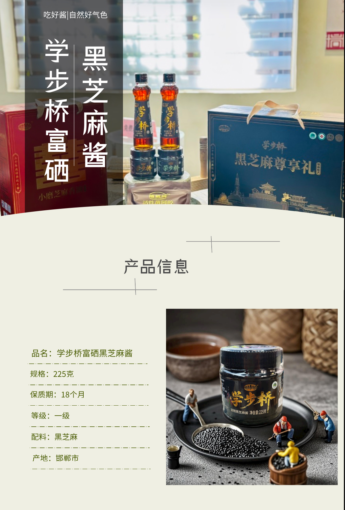 學步橋富硒黑芝麻醬,原料富硒黑芝麻來自世界硒都江西宜春,那里的土壤天然富硒,滋養出優質黑芝麻。制作時,先經層層篩選、清洗,去除雜質,再經石磨低溫物理研磨,全程無菌操作,最大程度保留營養。它質地細