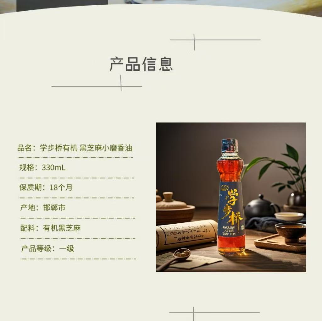 學步橋有機黑芝麻小磨香油,原料精選有機黑芝麻,天然又營養,品質有保障。不含多余添加劑,純芝麻原香。遵循GB/T 8233國家標準,采用傳統水代法工藝,不僅最大程度保留芝麻原香和營養,而且天然純凈、安全健康。質量等級一級,無論是涼拌、熱炒還是做湯,滴上幾滴,香氣四溢,既能享受濃郁芝麻香,又能攝取芝麻中的營養成分,給您的美食增添純正風味!為您的健康再加分!