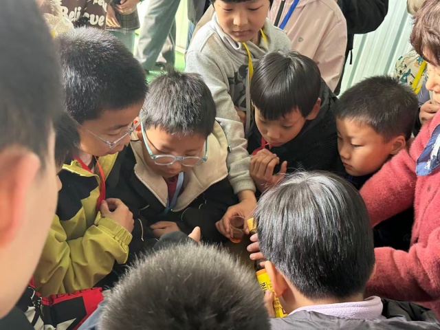 孩子們湊到杯前,用鼻子細細捕捉香氣的濃淡與純正度,再用眼睛觀察色澤的通透與質感。通過一嗅一看的精準對比,孩子們敏銳地捕捉到了細微差別,層層篩選后,成功分辨出香油的真偽與優劣,變身嗅覺靈敏、眼光獨到的香油鑒別小達人,在趣味實踐中練就了一雙“火眼金睛”般的鑒賞力。